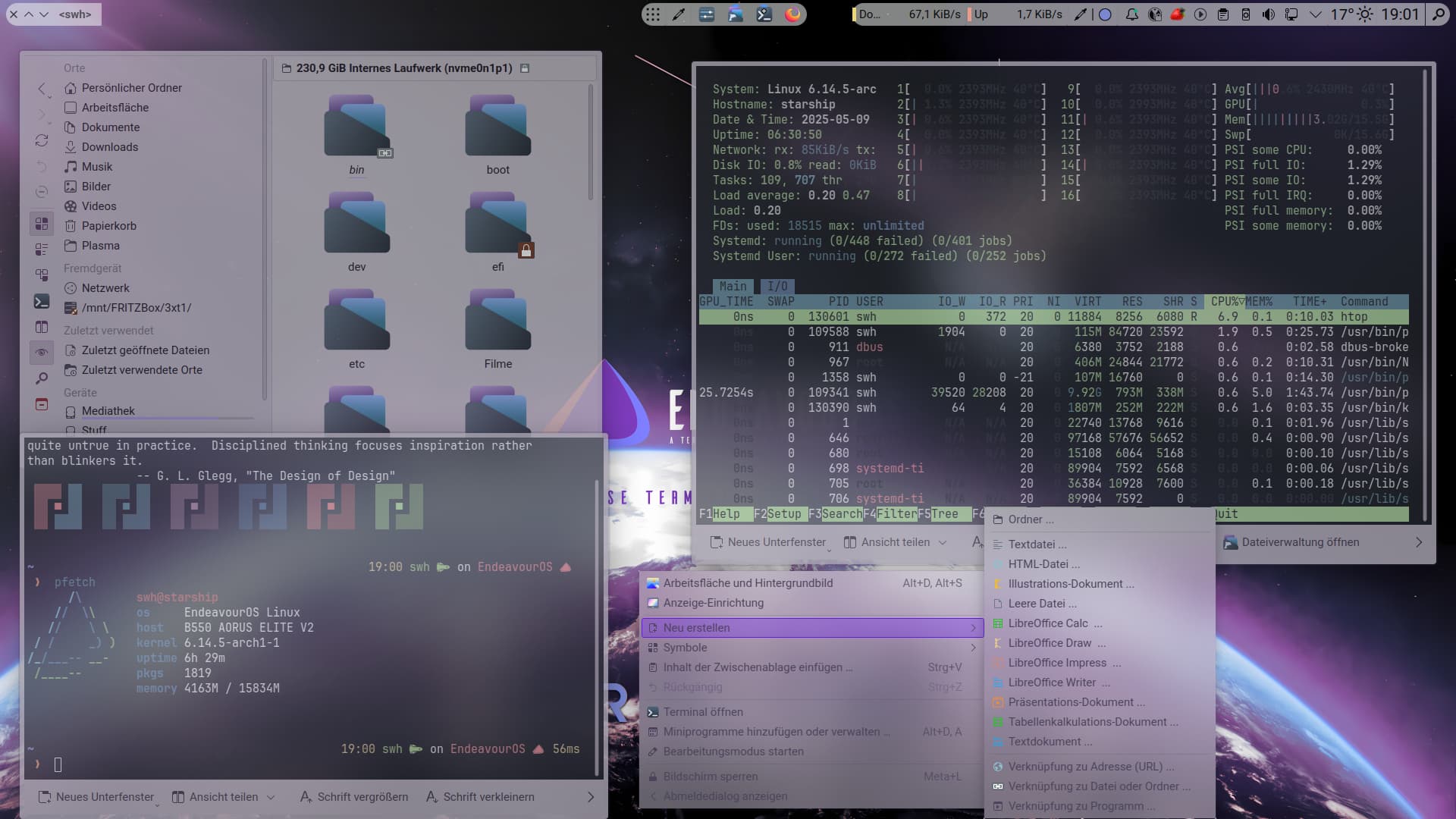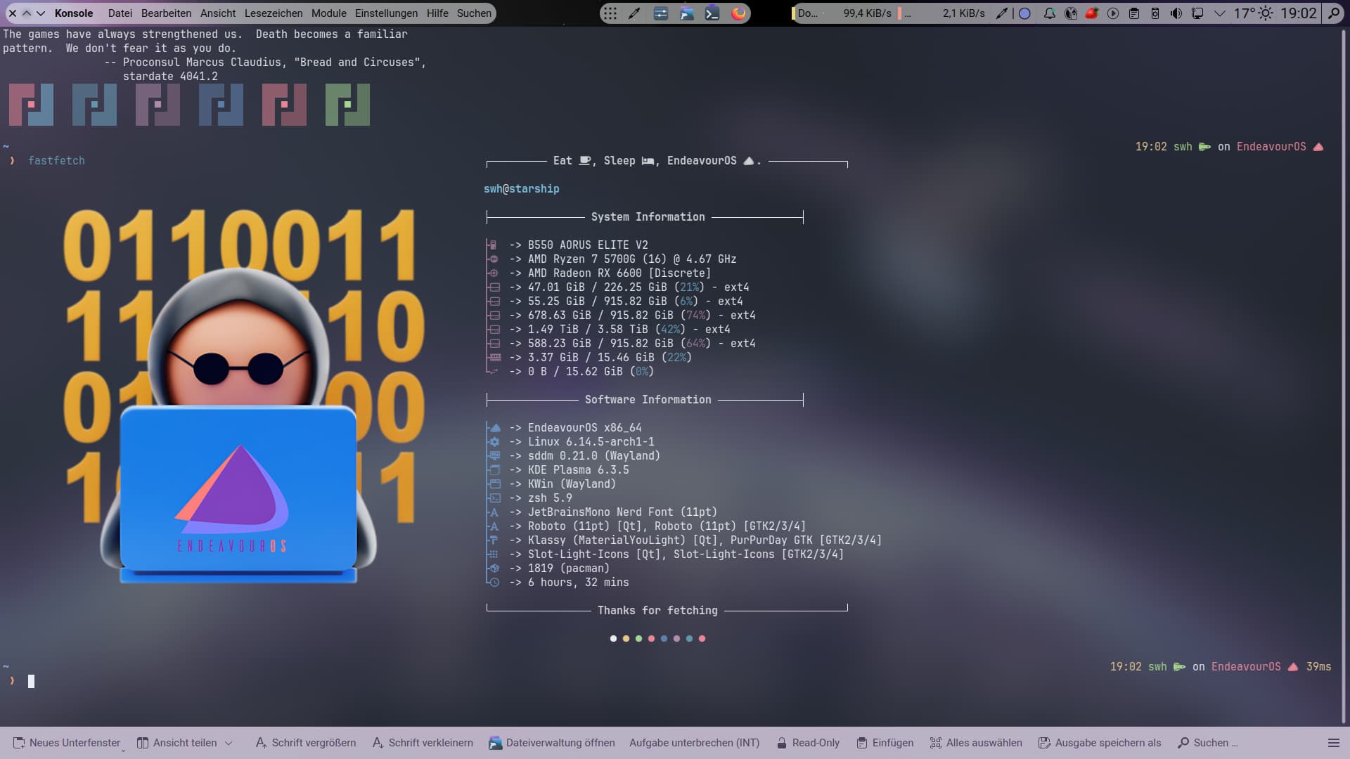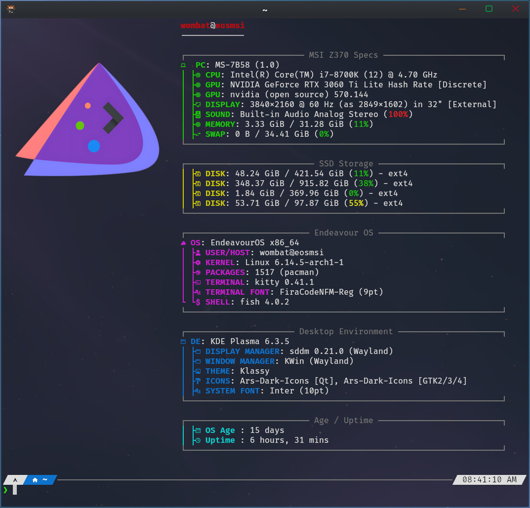 Well, I wanted to post my messed up desktop on debian, mostly for the changes to fastfetch and bash for displaying info (I then made the same changes on EOS too).