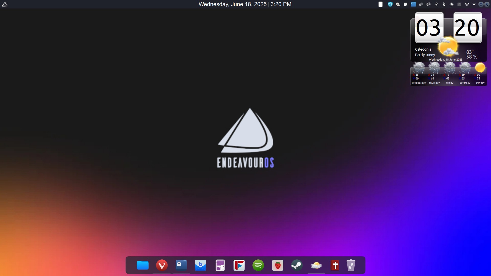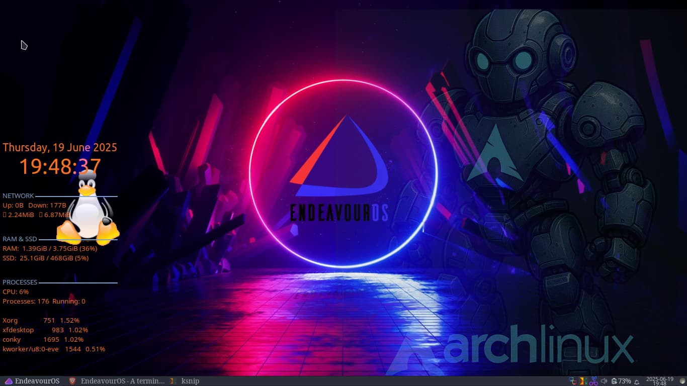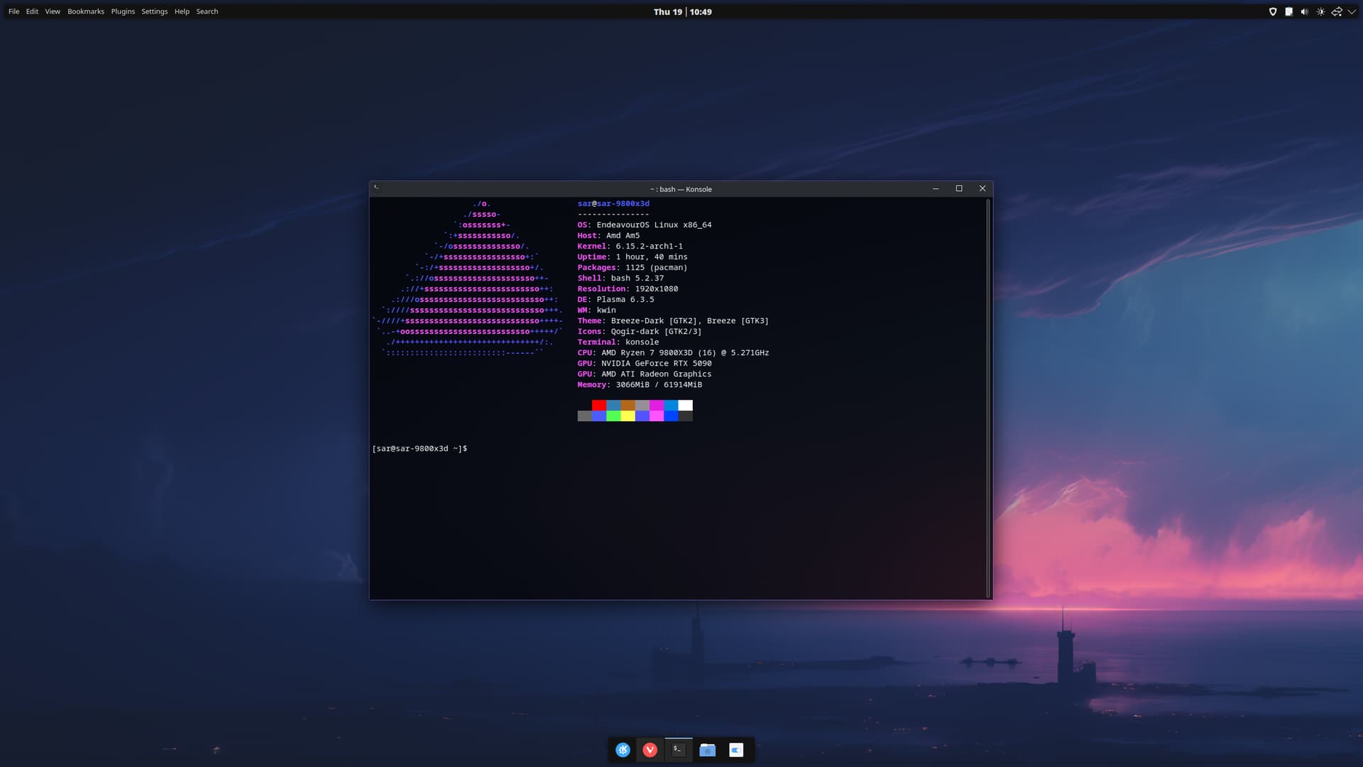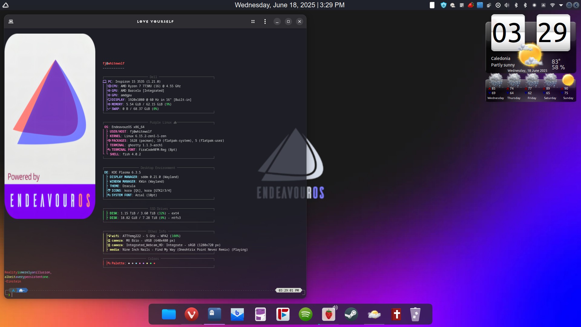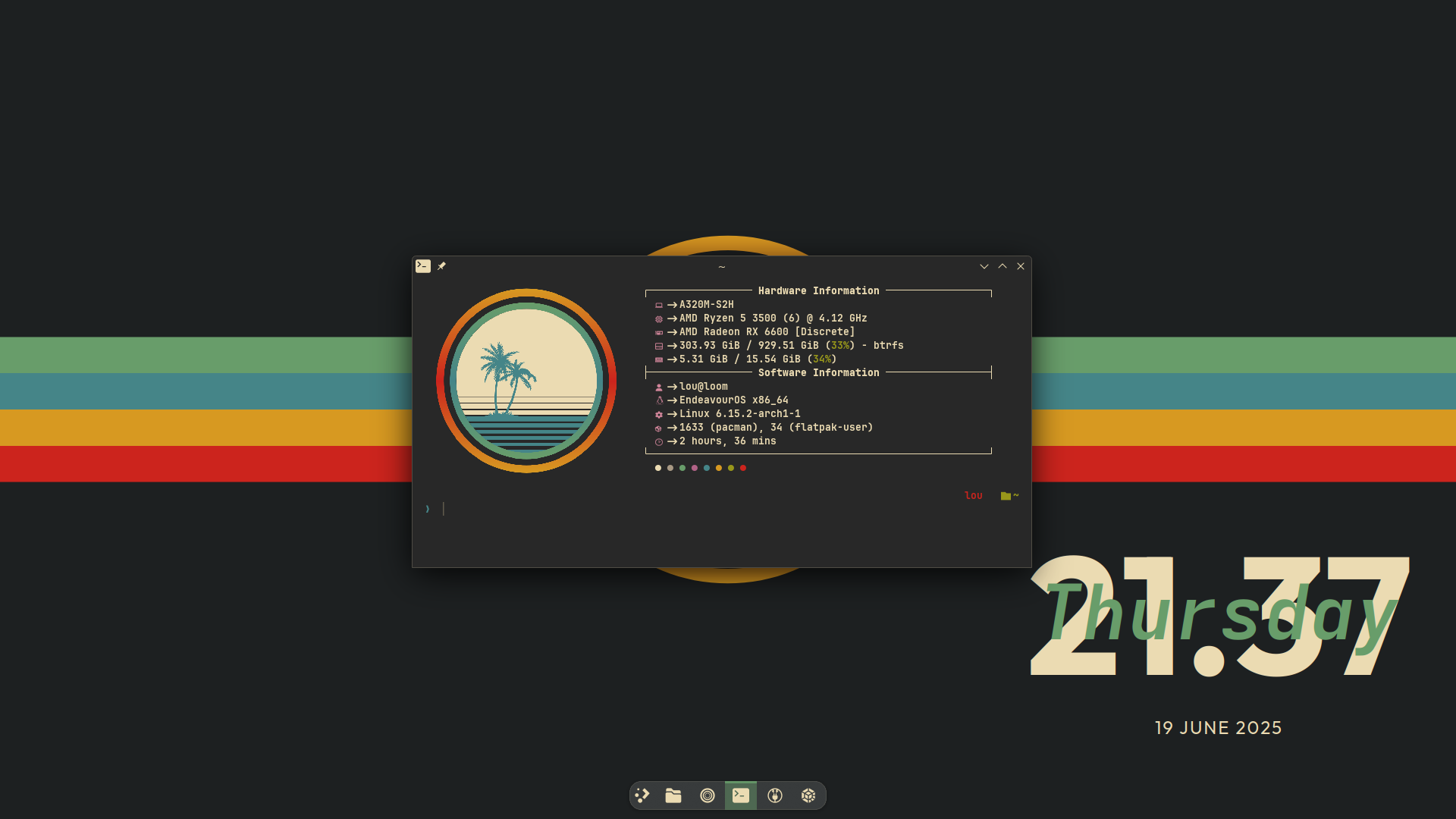 special thankx to @UncleSpellbinder for his fastfetch config which i manipulated to make my own & his awesome art in my fastfetch png image. the endeavouros image is so clean and sexy. i also use your lock screen image of the shuttle taking off and the eos logo on it for kde.