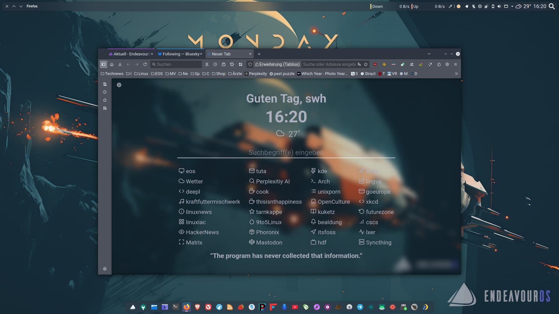 Tabliss on Firefox (transparent effect achieved by adding the desktop wallpaper as a custom background and blurring it).