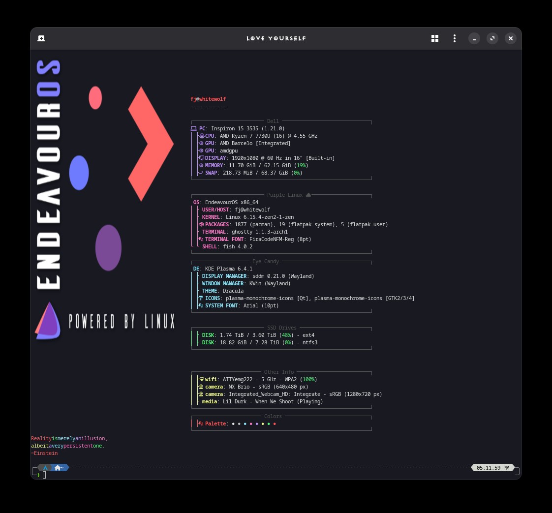i like the colorful palette of EndeavourOS logoz in your fastfetch conifg that is coolz