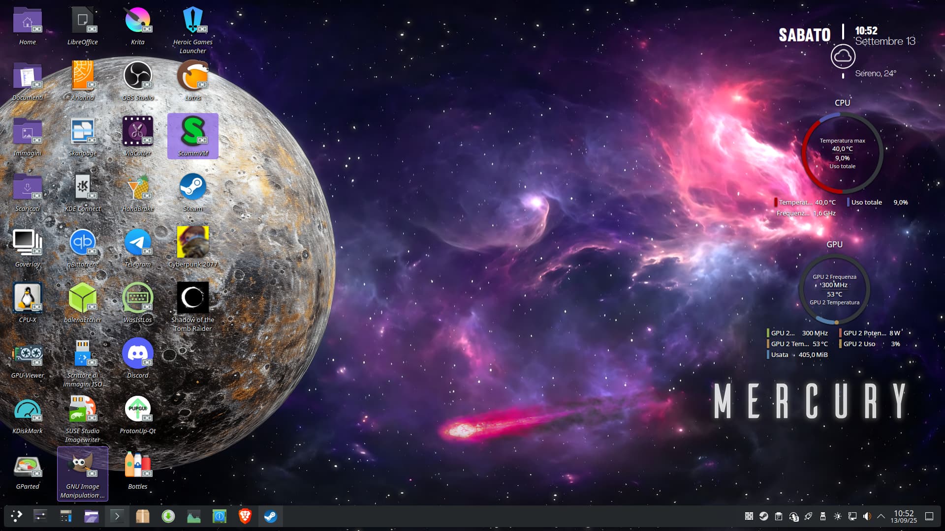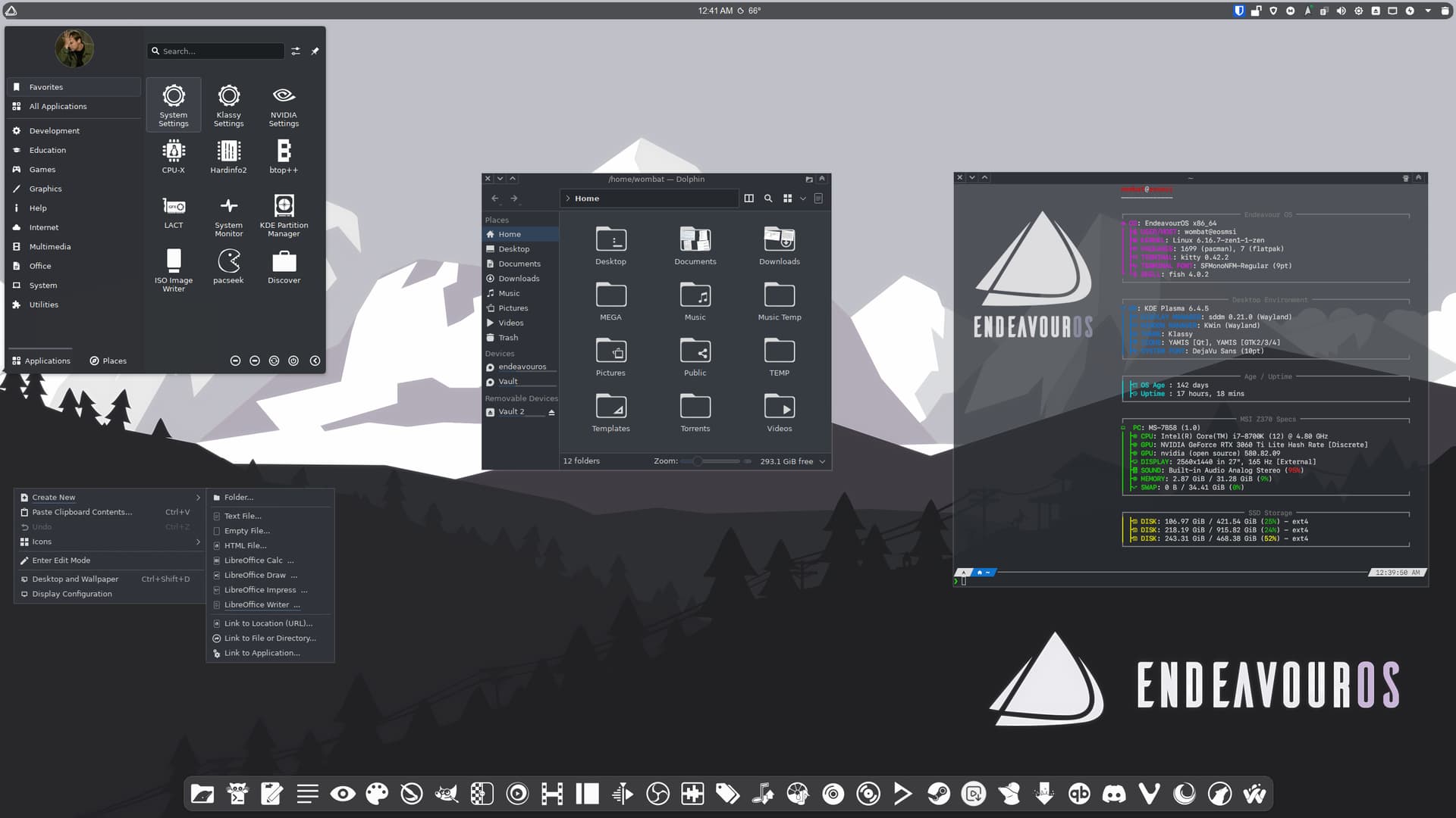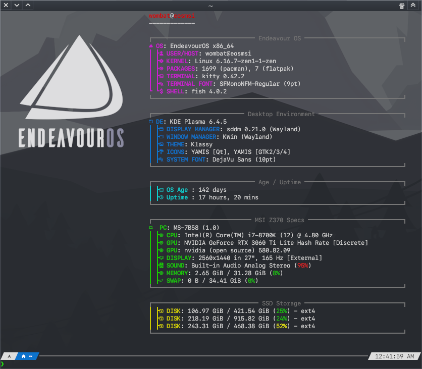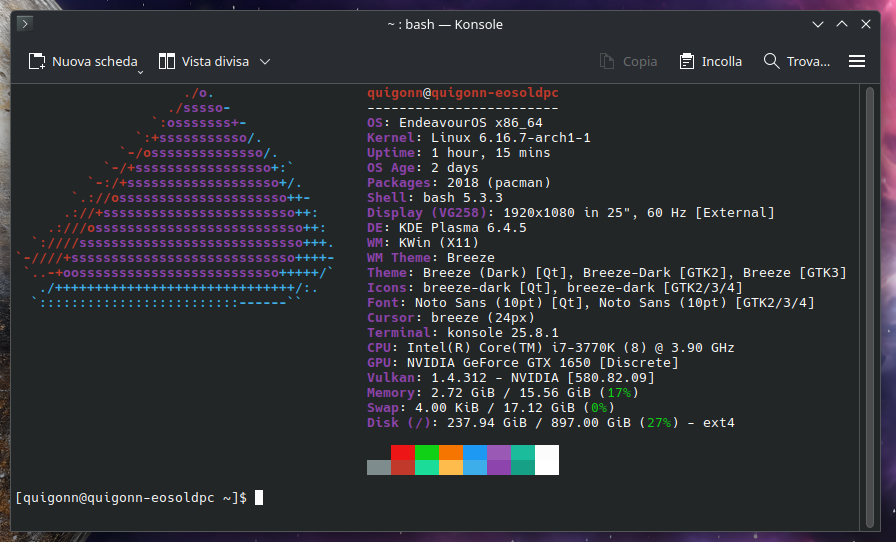 I got my old PC and installed EOS on it. The only thing different from when I used it before is the graphics card, which was an nVidia 980 Ti instead of the 1650 I use now. Sure, in terms of drivers and tweaks, it’s easier with the 1650, with X11 (I noticed it doesn’t like Wayland very much, apparently), than with the 980 Ti. I might lose a bit in graphics performance, but the important thing is that everything works well (also because the hardware is old anyway and you can’t expect much).
