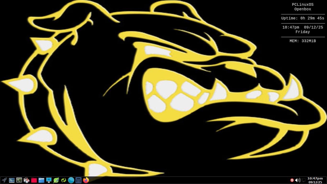 Wallpaper change for my PCLinuxOS openbox install. Yeah, I know, its not Arch but is the only non-Arch distro I have install on any of my laptops. Its the logo of my son’s football team. Iota Bulldogs.