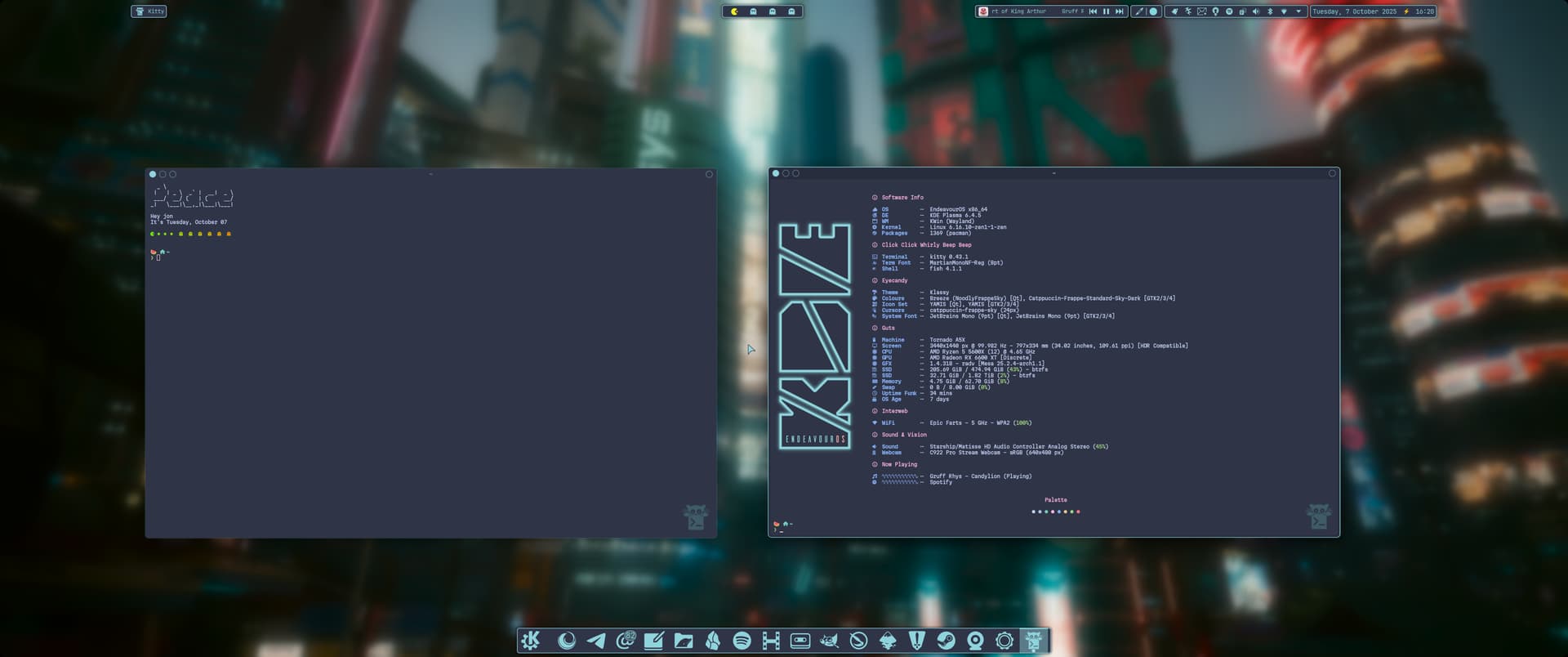Colour scheme is Catppuccin Frappe Sky, effects by Klassy and Panel Colorizer.