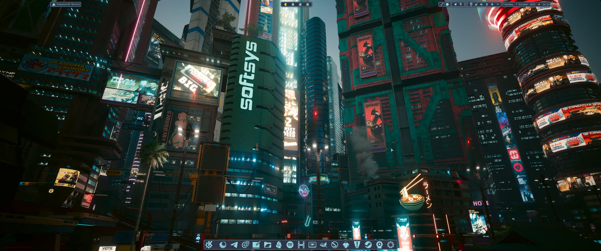 Wallpaper is from my Cyberpunk 2077 photomode collection. Fastfetch logo by me.