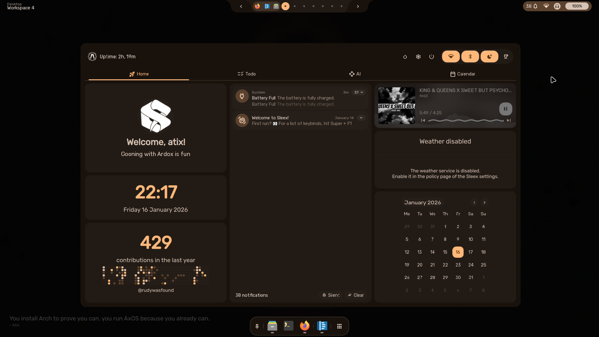 Welp, I “purged” my main laptop of all distros that are not Arch. I had one distro left on the drive that was not Arch based and lately I had not been satisfied with its operation so I just deleted it after saving the files from the drive and expanded my ArchBang partition to use the “new” space. I mean, one just can not do better than Arch! Oh, I use Arch BTW. ![]()