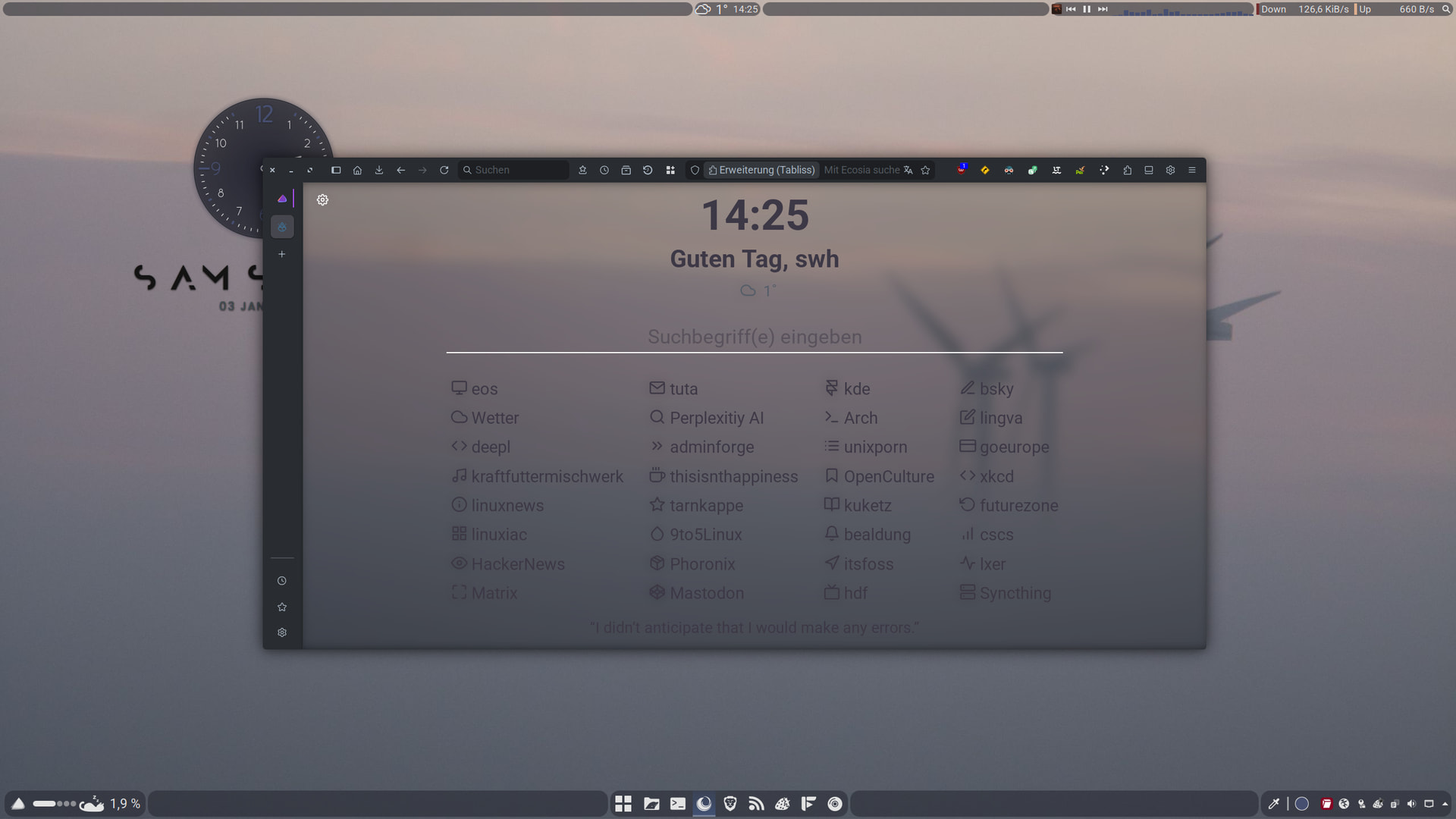 I wasn’t happy with Klassy and the colors. So I modified jux theme , but kept Klassy window decoration and made a few color adjustments. Wallpaper taken from here as @PackRat posted above. Some tinkering on Panel Colorizer. Well done Dailly driver noodled