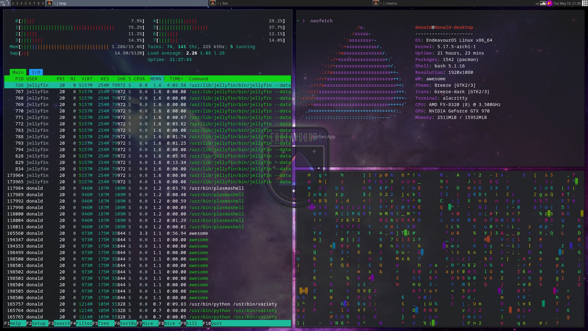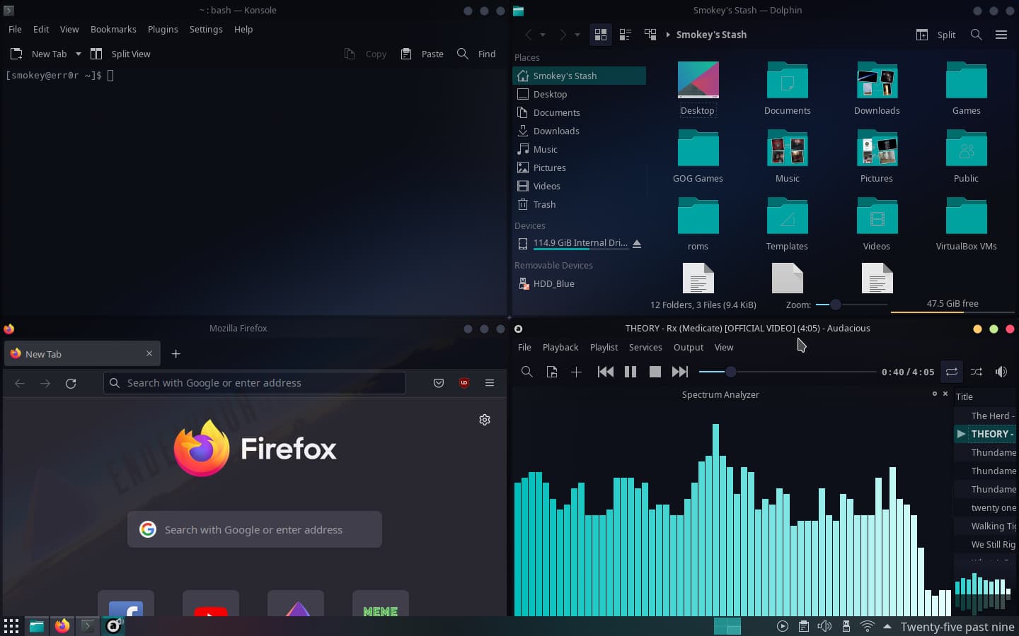 my first attempt at setting up a tiling window manager(awesome WM). Parts of it I find cool but while I am in it, I miss KDE, but then while I am on KDE I seem to miss being on awesome lol.