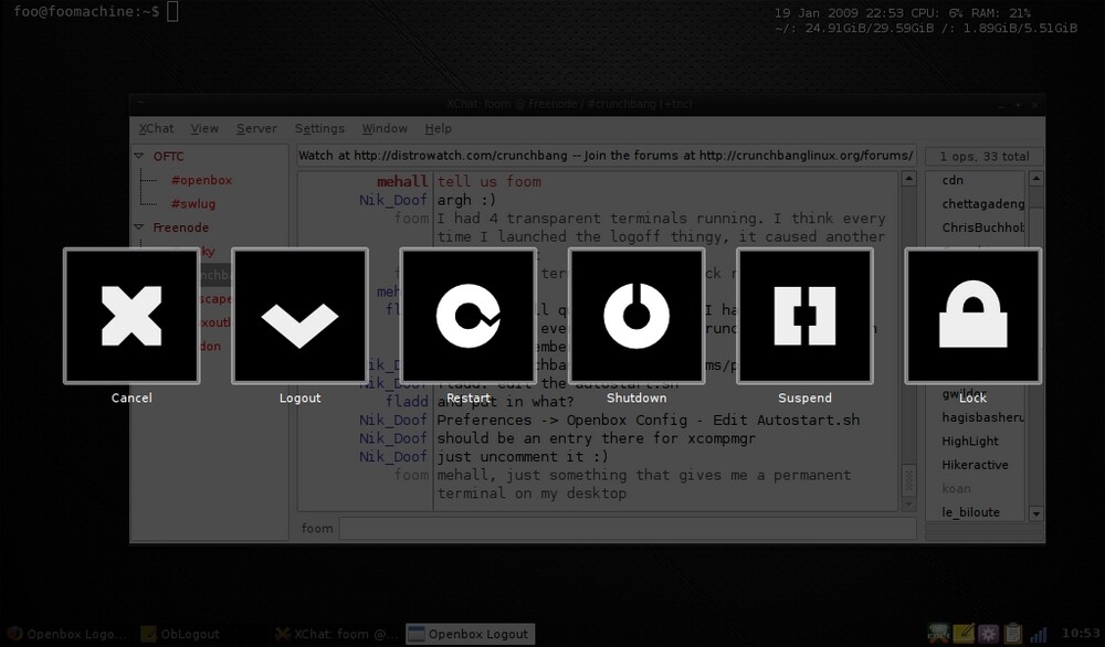 Oblogout is a set of power buttons (designed for Openbox) that appear on screen, such as ‘logout’, ‘shutdown’ etc, if you have set it up for Fluxbox