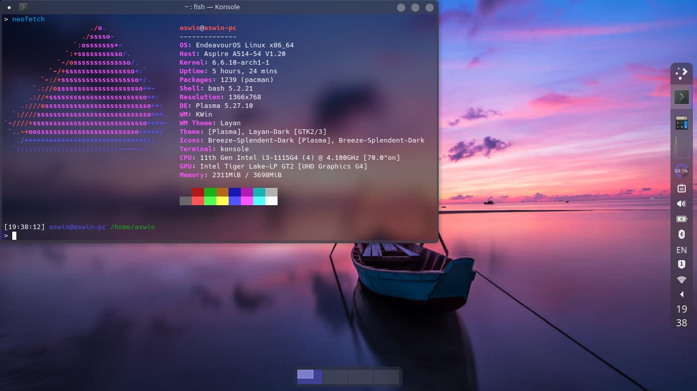 Very nice clean look! I really like how peaceful your wallpaper is and colors match Endeavour logo ![]()