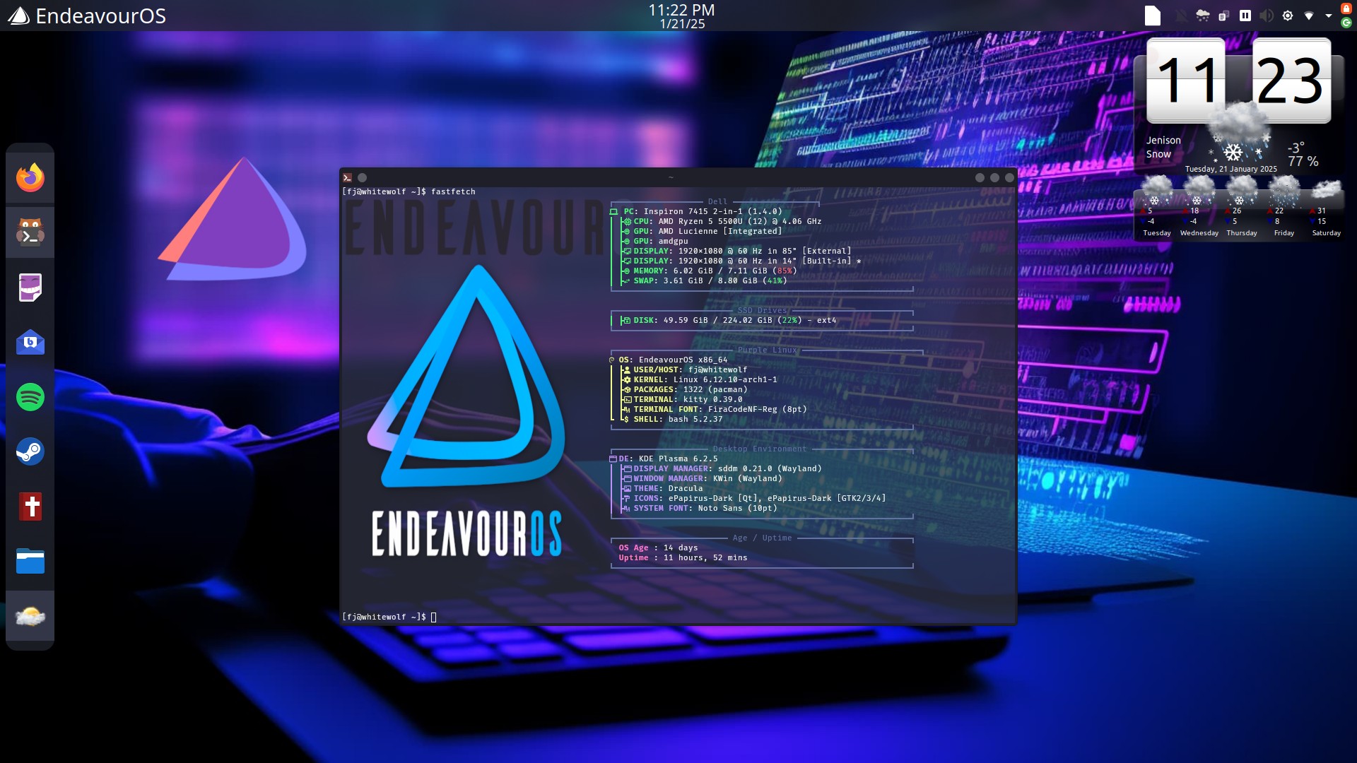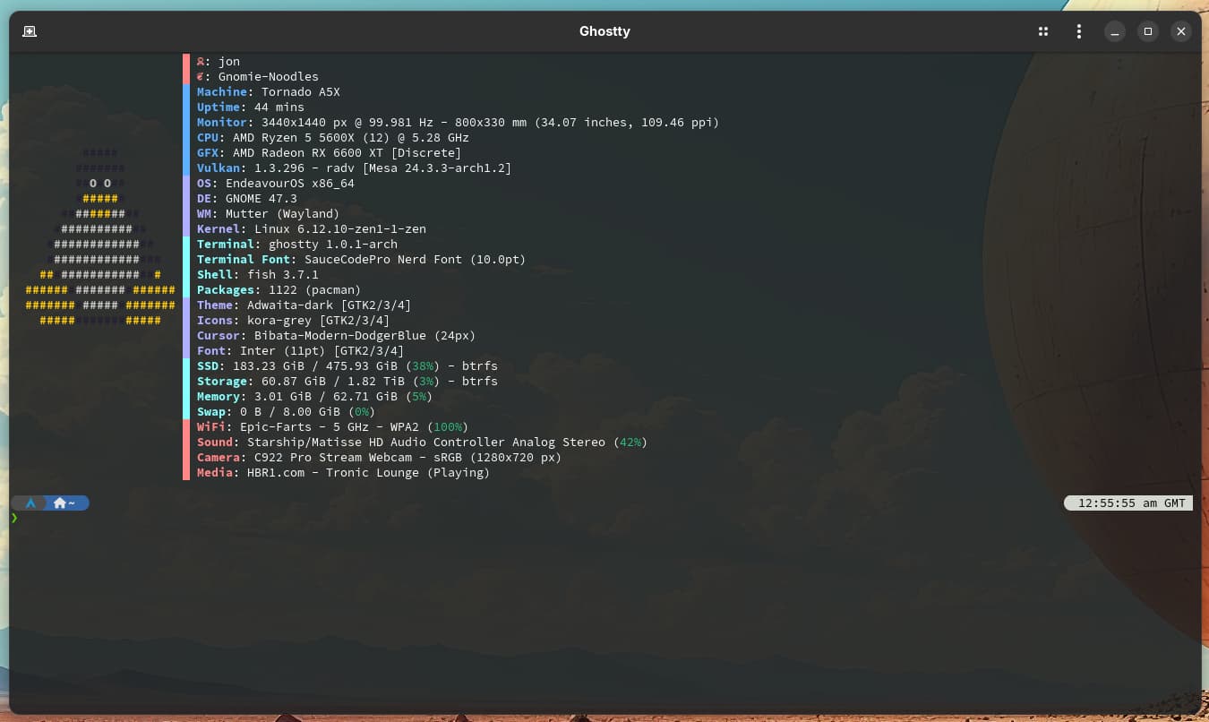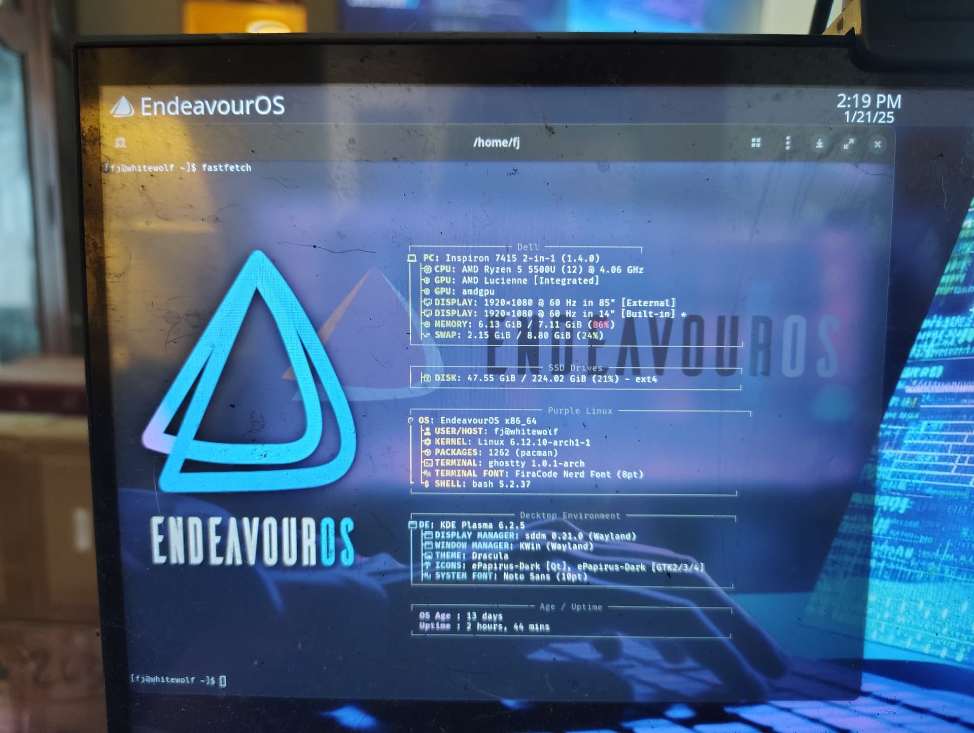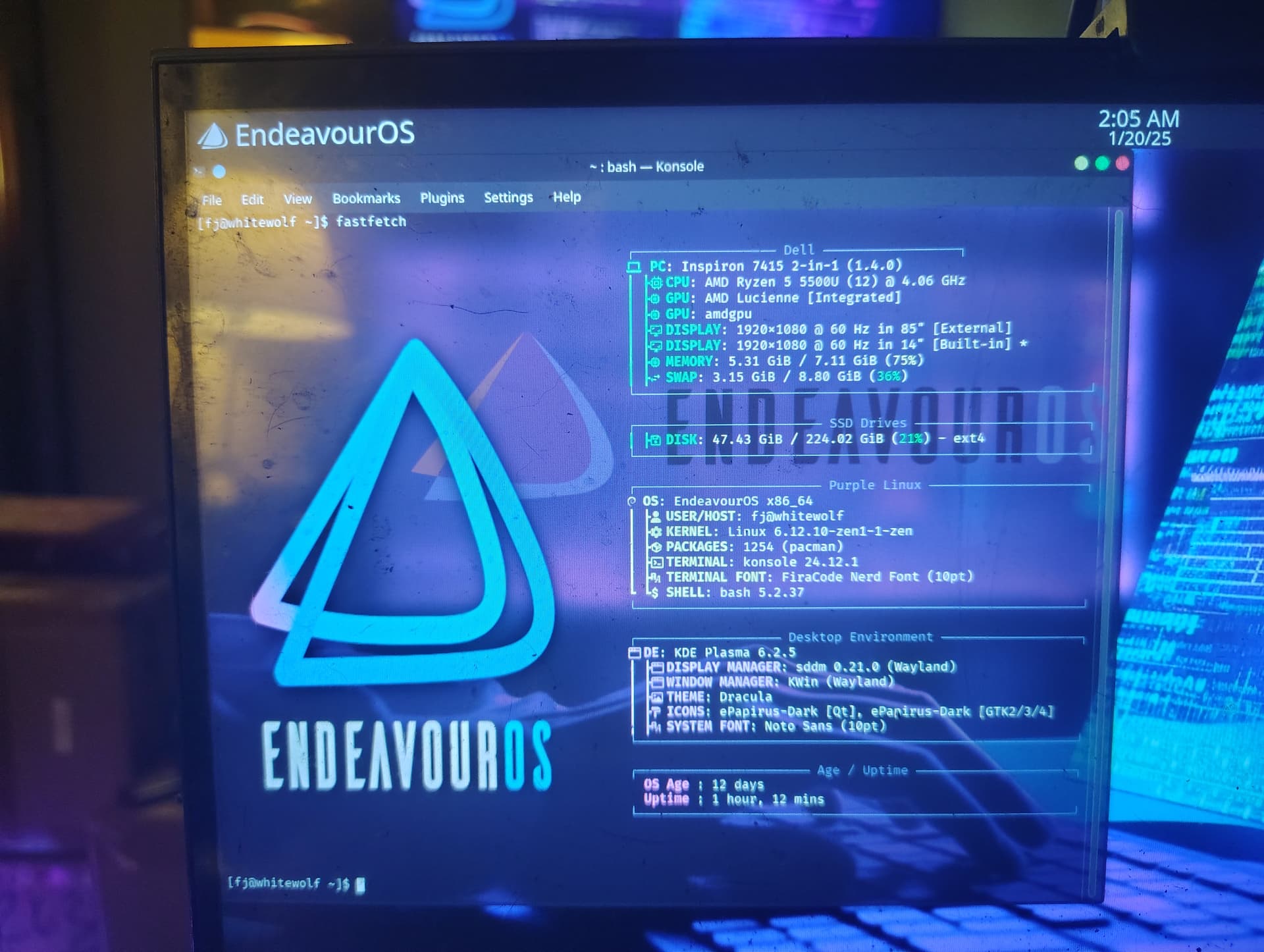 to get here. Already had a delicious breakfast at some restaurant called Anna’s House here in west, Michigan. It was really good. Smoking the last of my weed now. Anyway here is my desktop. I slapped an EndeavourOS logo on this wallpaper. Used someone elses fastfetch configuration. Very appreciative of those that created & maintain EndeavourOS because I love Endeavouring.
