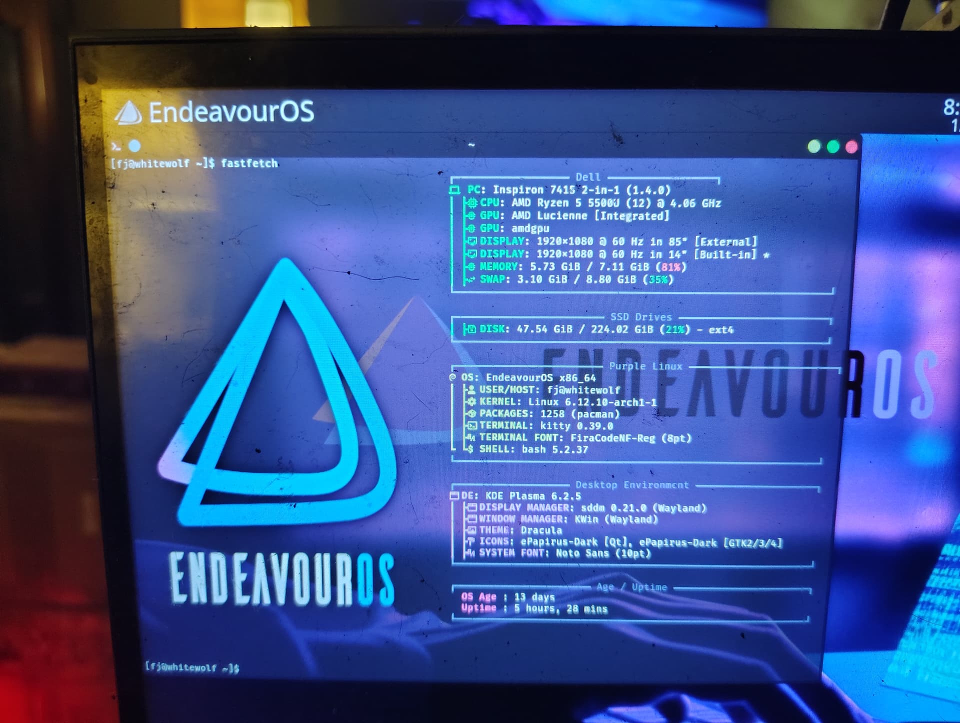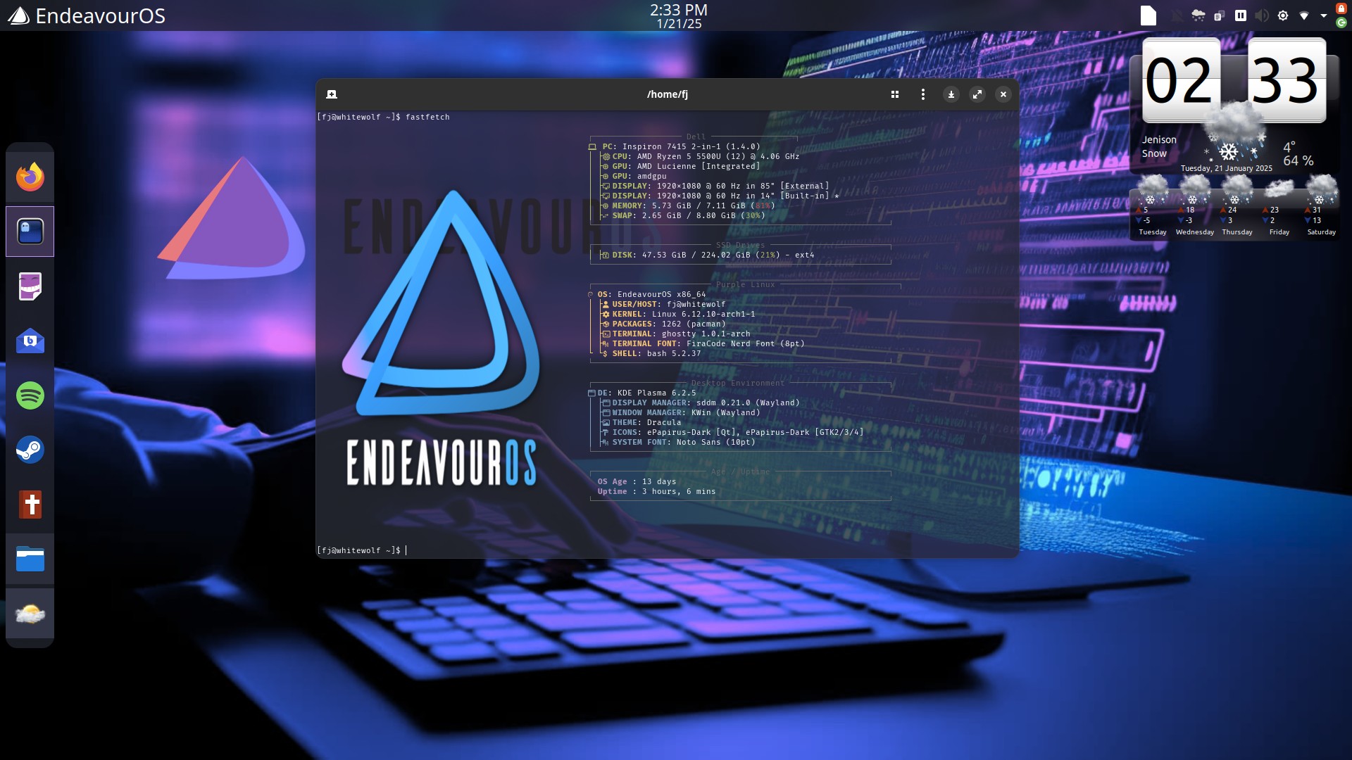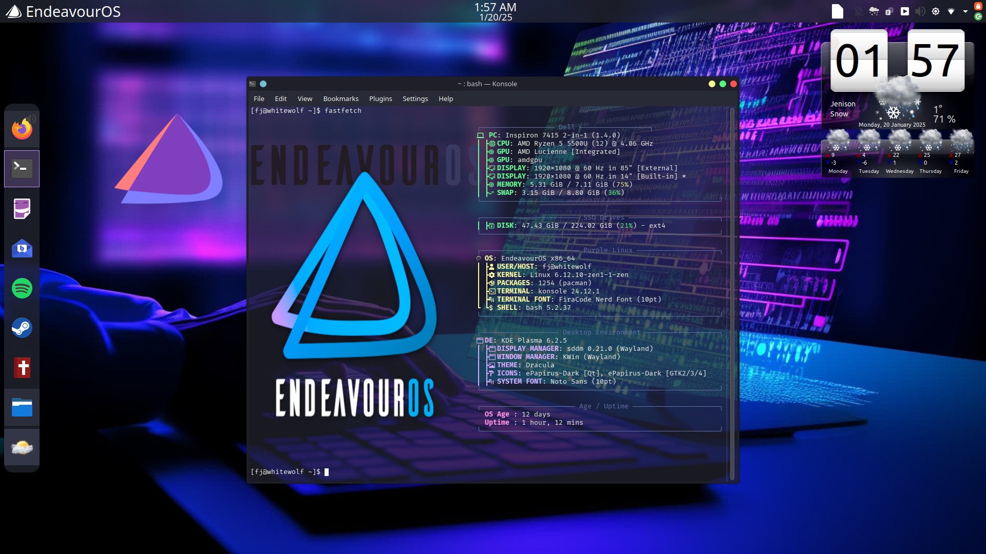 to get here. Already had a delicious breakfast at some restaurant called Anna’s House here in west, Michigan. It was really good. Smoking the last of my weed now. Anyway here is my desktop. I slapped an EndeavourOS logo on this wallpaper. Used someone elses fastfetch configuration. Very appreciative of those that created & maintain EndeavourOS because I love Endeavouring.