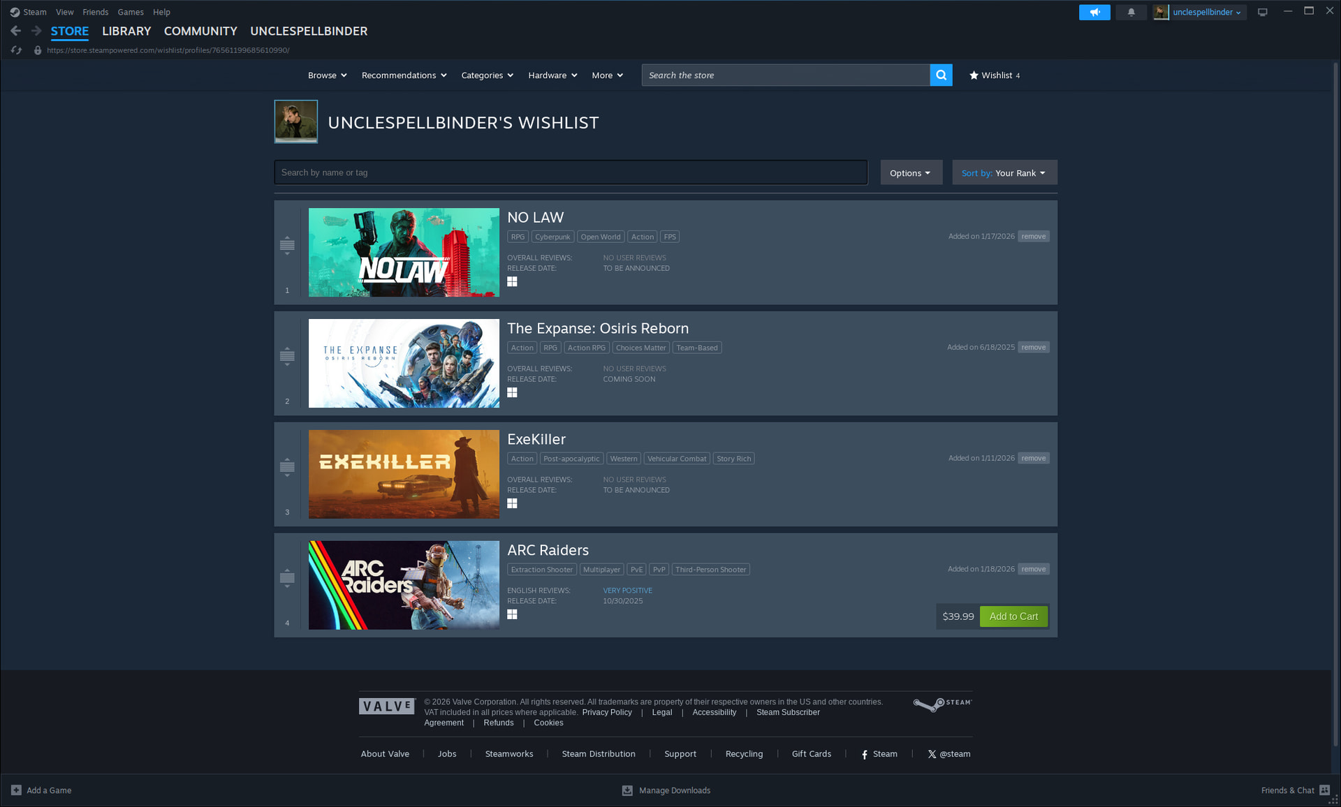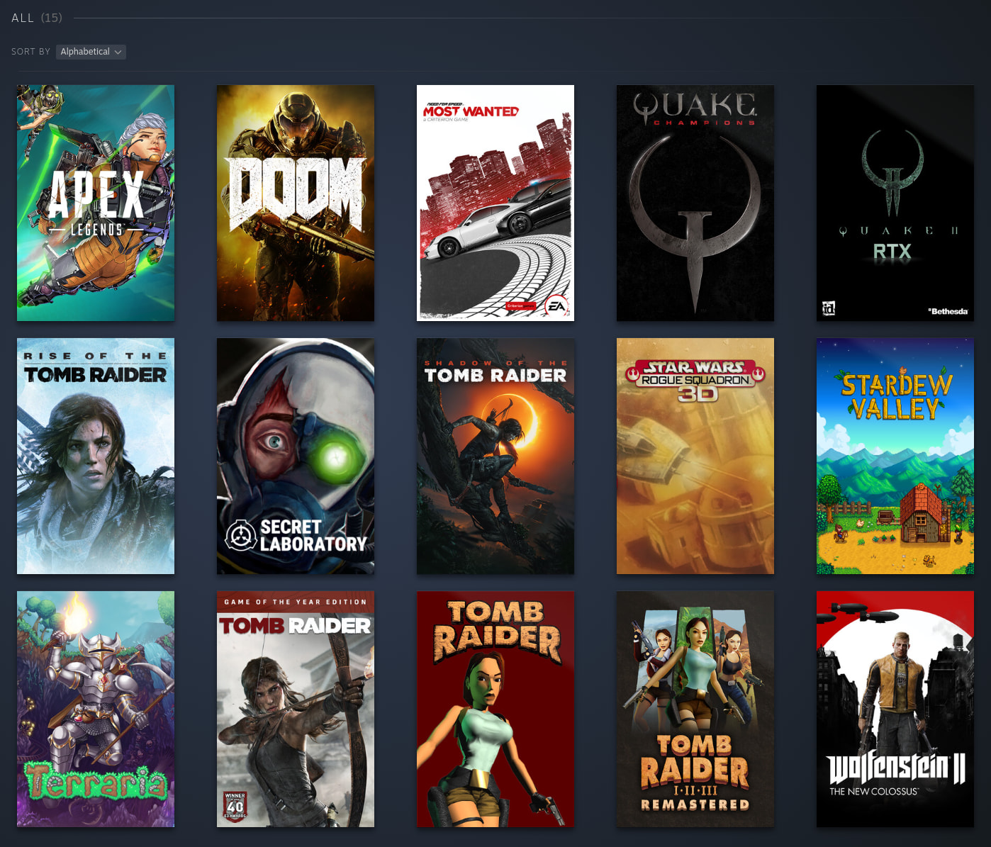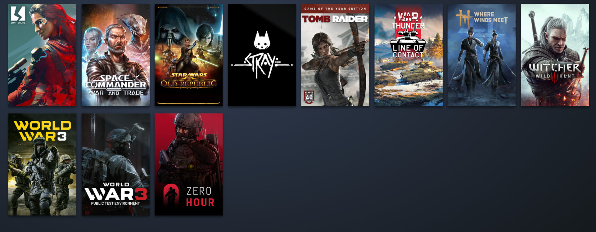 Here’s mine as of January 24, 2026. I’m slightly picky and only add to my library and/or install exactly what I want. A mix of some cool free-to-play and purchased games.