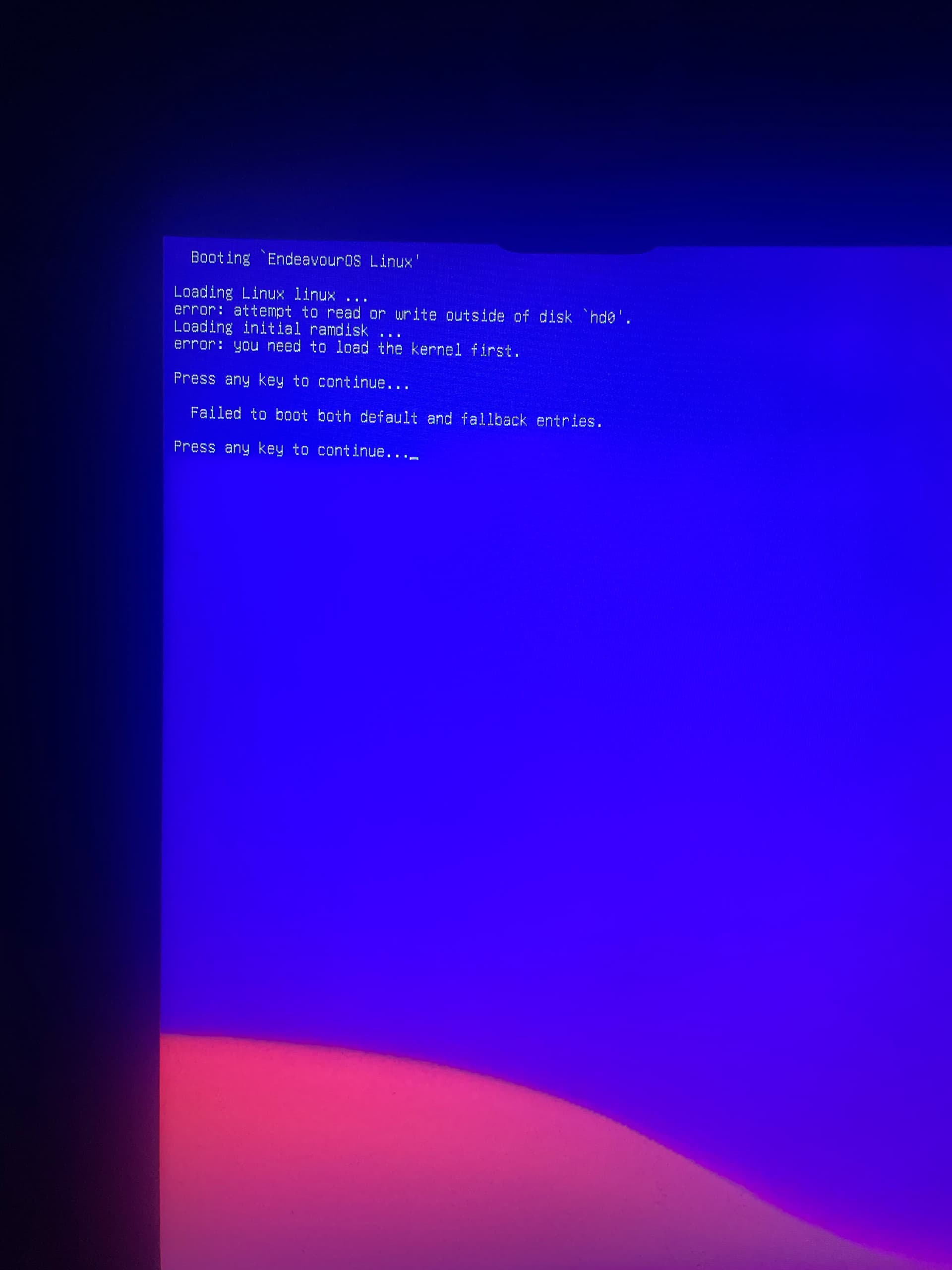 After installing endeavour i restarted my system and got stuck at this menu. after a few seconds it tries to boot into endeavour before giving this error message. i tried hitting del on my keyboard to try go into my bios to try booting from my usb drive to actually get to a terminal but i dont think its taking my keyboard input.