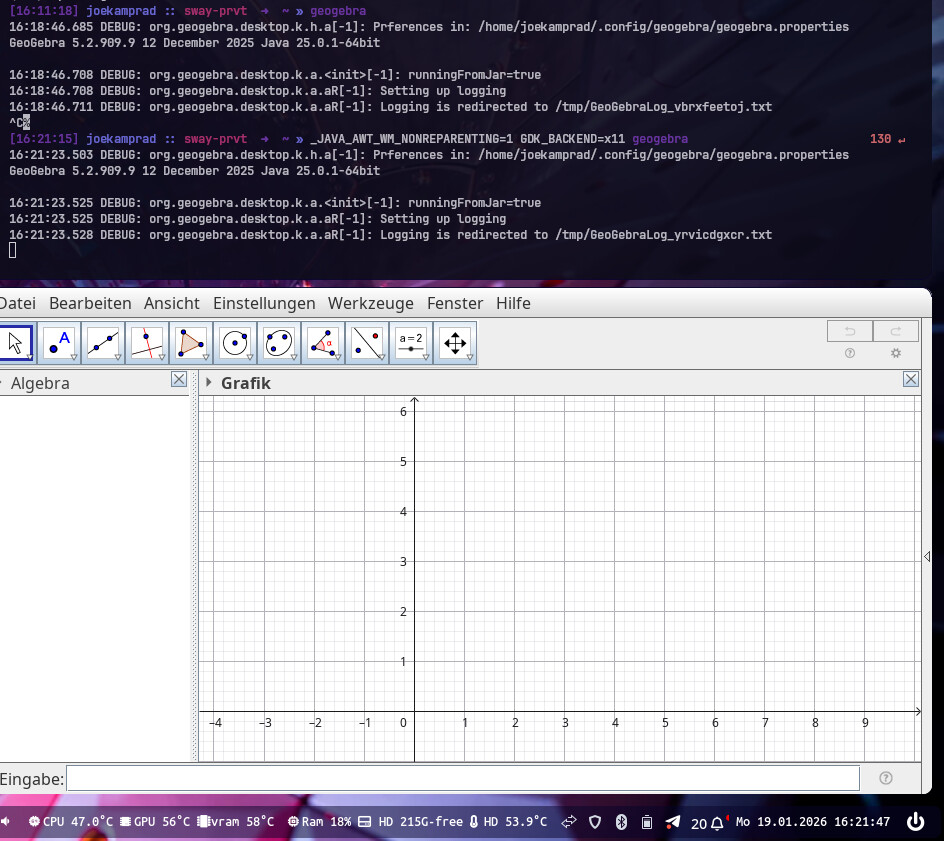 Basically title, I want to switch from i3 to Sway, but Geogebra (geogebra from Arch repos) launches to a white screen. It’s fine on i3, or Xfce, or Plasma…