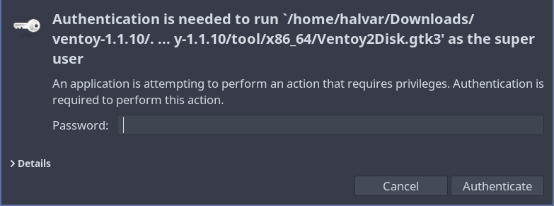 I did my research on this topic and what I found is I need a Polkit agent. However, I have one running already, it’s polkit-gnome, and when I try to launch Ventoy, I get the authentication window: