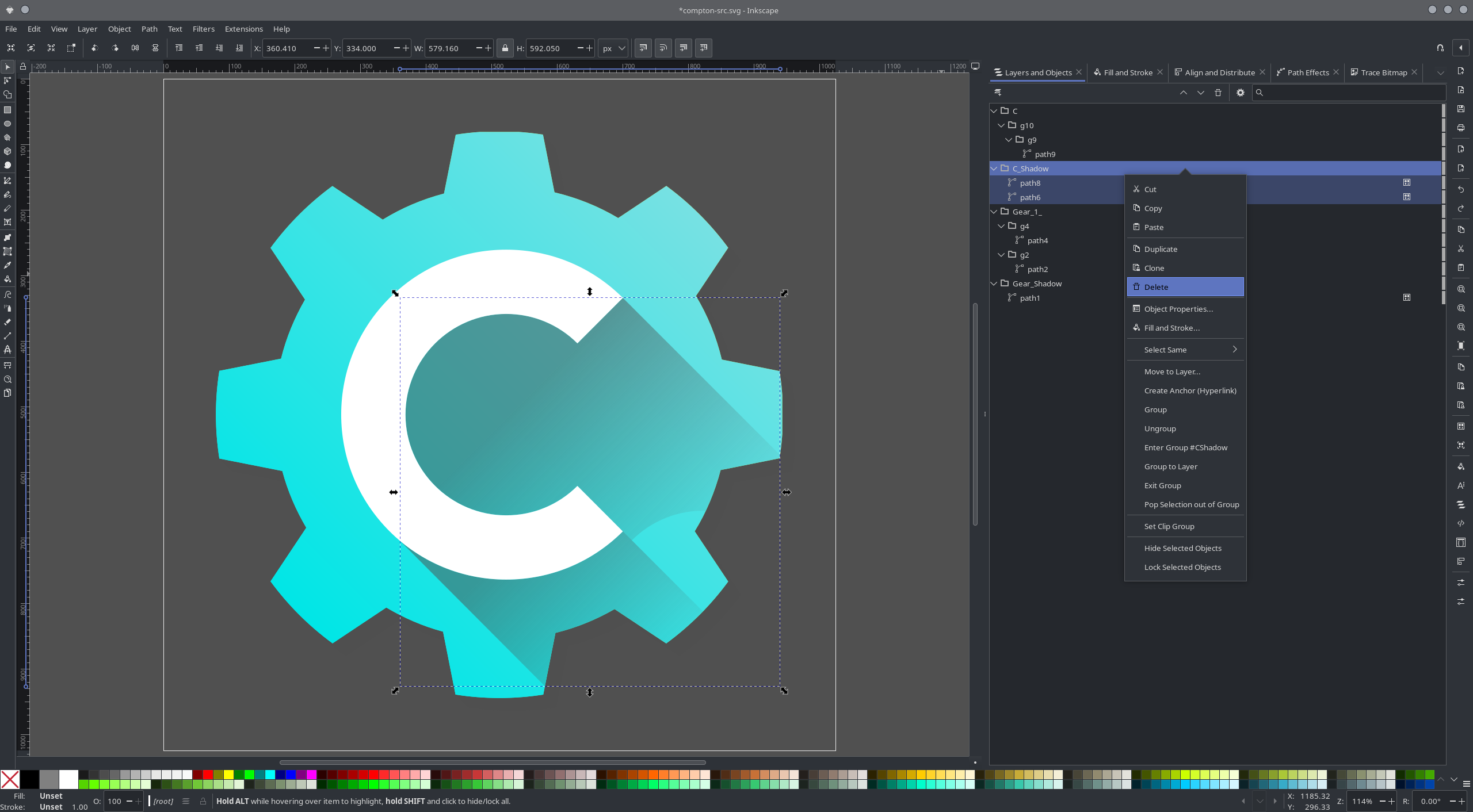Next, I only wanted to keep the gear and the ‘C’ symbol. While both were visible, there were two extra objects I didn’t need: