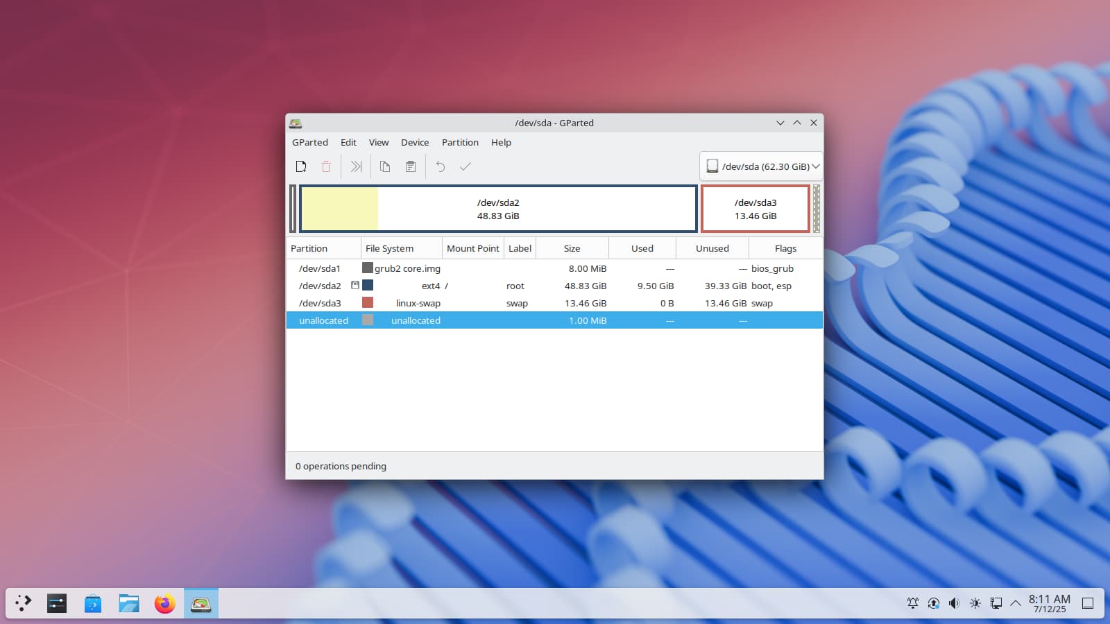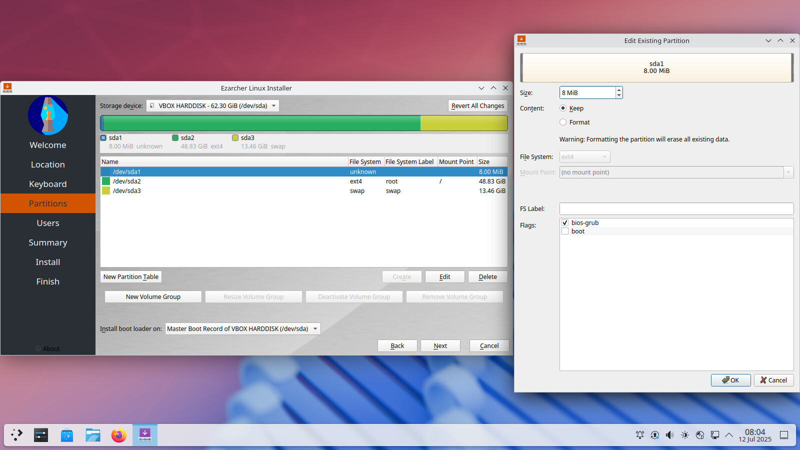 When I reboot I get the same boot error. And when I boot into the live environment Gparted shows the 8MiB partition instead has been flagged as ext4 instead of unformatted and thus marked as ‘unknown’.