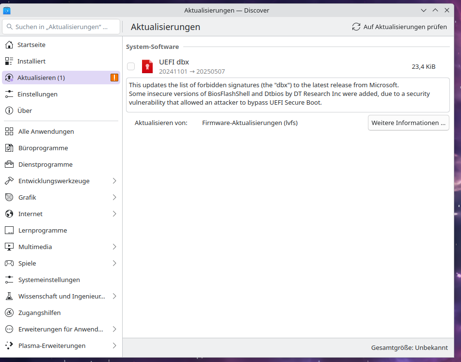 als ich gerade die Aktualisierungen in Discover unter KDE-Plasma abrief, entdeckte ich da diese dbx-Datei von wem. Microsoft!!! Und weswegen belästigen die mich sogar jetzt in EOS, weil sie mir mit ihrem bekackten Secure boot auf die Nerven gehen wollen.