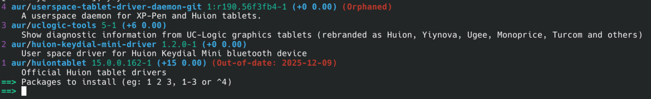 Just for the record your aur output shows that the huiontablet package is not installed (should show something like already installed).