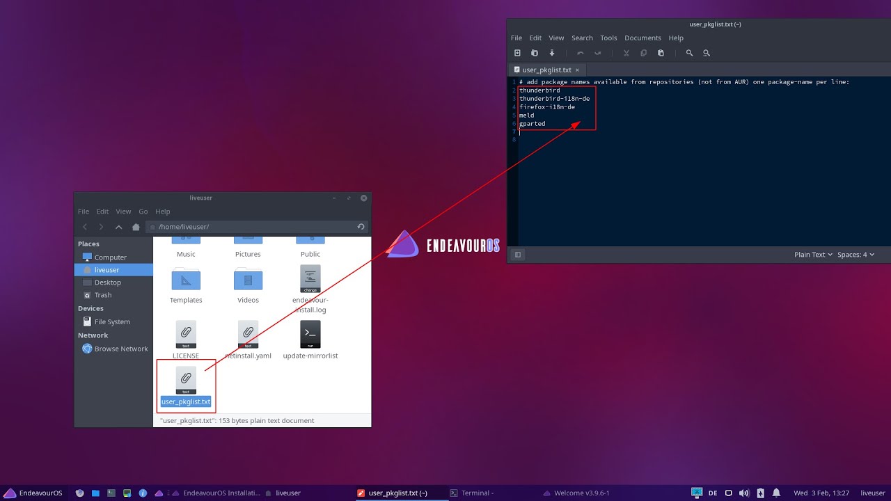 --pkglist=URLzum Hinzufügen zusätzlicher Pakete während der Installation, auch mittels user_pkglist.txt Datei, die du im home Verzeichnis des liveusers findest. Du kannst diese bearbeiten, um zusätzliche Pakete zu installieren.
