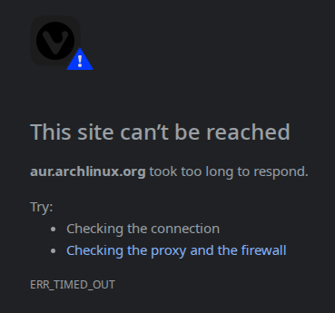 At first I thought it was because of my proxy server. Checked, and found that it’s because AUR’s not functional. Then found that it’s already been two days.