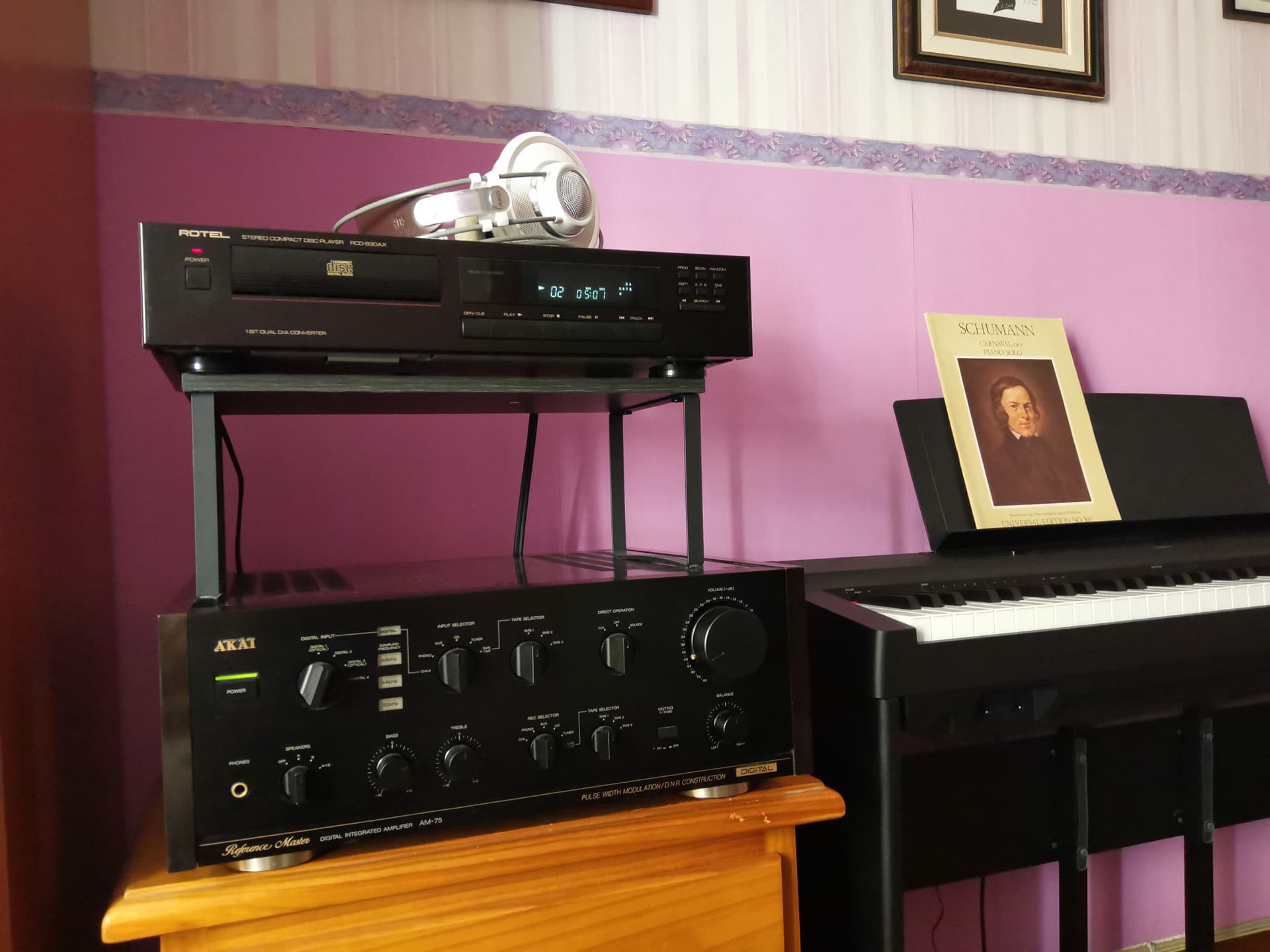 Meet my “little” AKAI AM-75, a 20 kg beast that’s given me countless great listening sessions. With a clear, spacious, and analytical sound, it pairs wonderfully with the equally clean -and slightly warmer- Rotel RCD-930AX. Both are solid 90s classics. Running them through some decent Bowers & Wilkins speakers, the sound is just fantastic. And with headphones? Absolutely brilliant for those long, relaxed nights lost in the music.