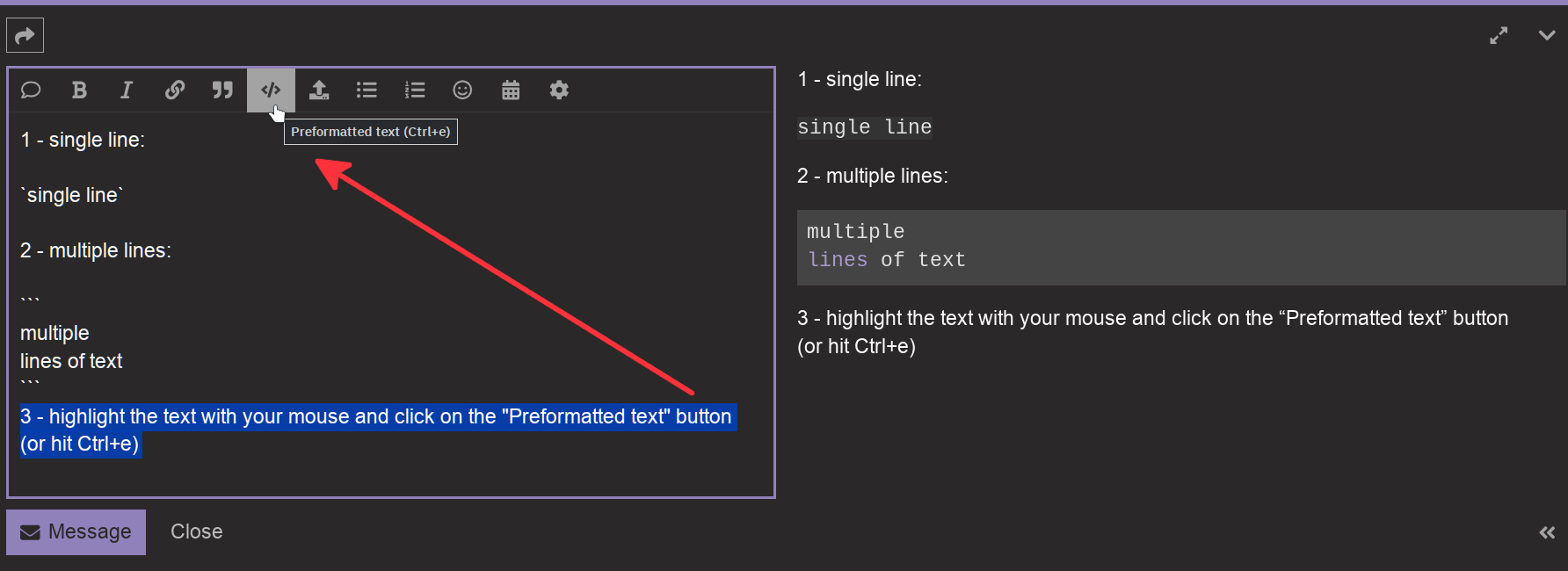 3 - Use your mouse to highlight the text, and click on the “Preformatted text” button in the “Reply” toolbar (or use Ctrl + e). This will add the backtick marks for you.
