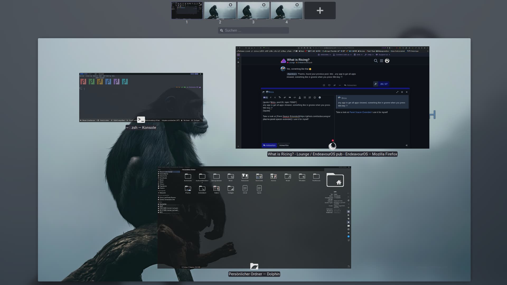 Post your results when you figure out what you want to do. I remember there is something that looks like Hyprland for KDE, but I don’t remember the name. I used it for a while, then got bored. I am more of a minimalist, as you may see.