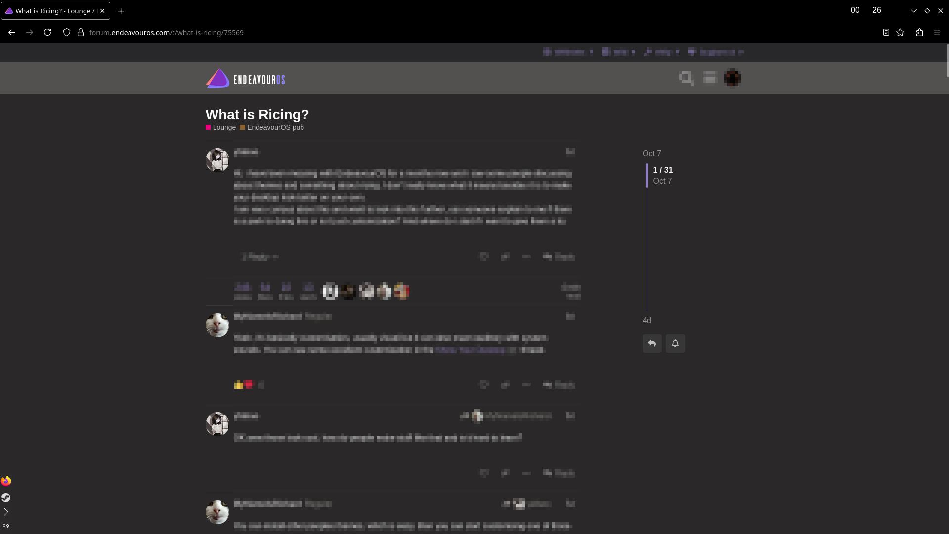 I am not a deep ricer, but I am very passionate about customising my system. It is what brought me to Linux. I used to be more heavily into themes, but I mostly use KDE defaults now, as I like to see small changes they make, e.g. the addition of an actual dolphin to the dolphin icon. I have time added to my Firefox. No time on toolbar. Toolbar set to display above windows and to fit to content. I used to have time on toolbar with it set to display above video games, but I stopped when I started playing ancient video games, as they don’t take focus from my mouse, so I’d end up clicking the toolbar unintentionally.