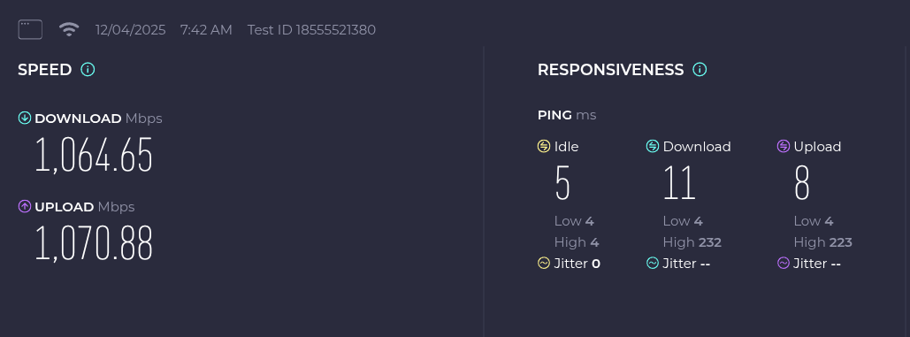 In Canada, Ebox with a 1 Gb/s Symetrical fiber. My lan is hybrid 10/1Gb/s so my modem connection is 2.5 Gb and since my ISP is overprovisionning the connections I get a little more.