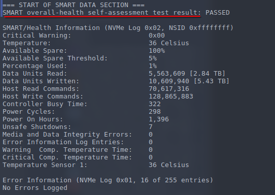 Look for the “SMART overall-health self-assessment test result” or a similar line to see if it reports “PASSED”.
