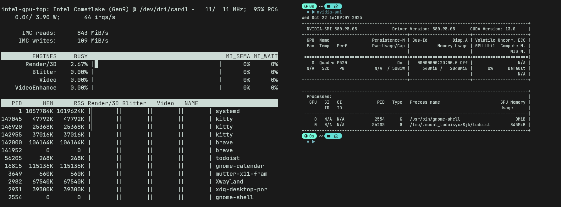 I initially thought its a Hybrid GPU switching issue, where all load is getting on either one of the GPUs, but after running nvidia-smi and intel_gpu_top, it seems like the load is getting balanced between both the gpu