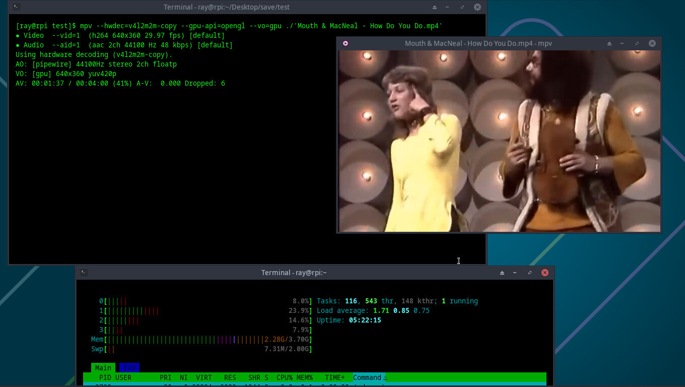 This is what the AI is telling me. So maybe these packages in the ALARM repo are older RPI-4 packages and are not compatible with RPI5. However, they allowed me to utilize hw acceleration for x265 which was not possible with the standard vlc or mpv packages.