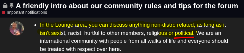even if i am not very long following this whole linux topic, i have noticed that many linux distributions become political and then drama happens and the community and also developers split up bc they start hating on each other. in the end some projects even die because of it. i dont want this drama. which is why i chose endeavour as it has this rule.