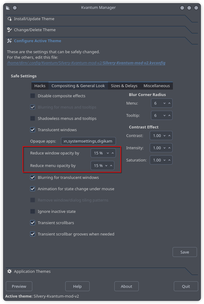 I just found out that if you want to set the translucency or transparency level in Kvantum to match your window decoration and Plasma style, you need to do it through the Kvantum Manager or by editing the kvconfig file. No wonder I couldn’t change it through the Kvantum .SVG file!